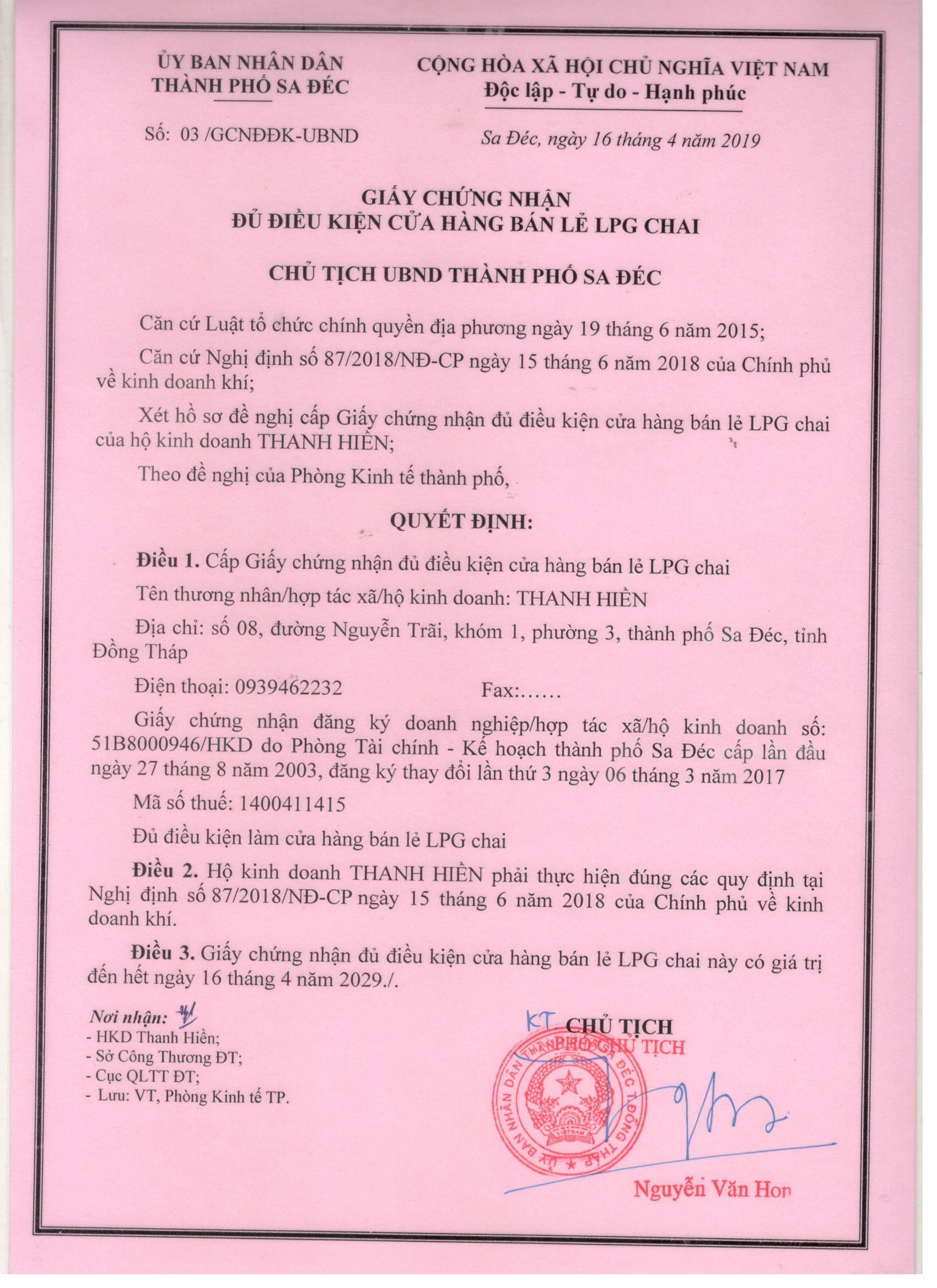 - Gas Thanh Hiền: 8 Nguyễn Trãi, phường 3, thành phố Sa Đéc, tỉnh Đồng Tháp