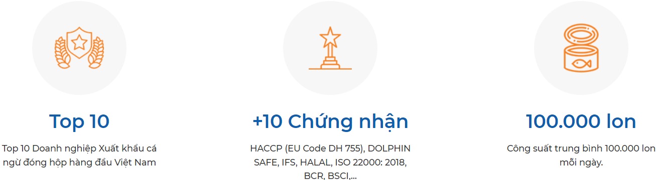 - Đặc biệt được công nhận Thương hiêu quốc gia năm 2020 và năm 2022 cho sản phẩm cá ngừ đóng hộp, cá nục/cá mồi sốt cà.