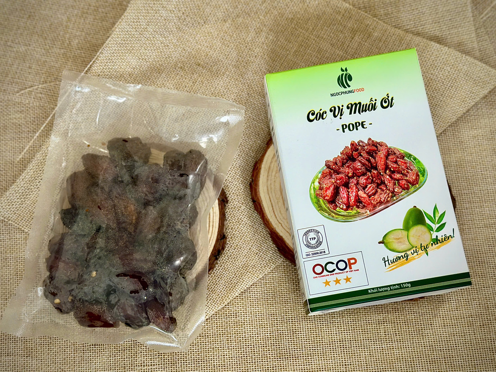 Cóc Vị Muối Ớt – Hộp 150gr là một sản phẩm đạt chứng nhận OCOP 3 sao, thể hiện sự cam kết về chất lượng và an toàn thực phẩm. Sản phẩm được chế biến từ trái cóc xanh tươi ngon, kết hợp với vị muối ớt cay nồng, tạo nên một món ăn vặt hấp dẫn, vừa thơm ngon vừa bổ dưỡng. Với quy trình sấy nhiệt lạnh tiên tiến, Cóc Vị Muối Ớt giữ nguyên được hương vị tự nhiên, độ giòn đặc trưng của cóc, đồng thời gia tăng hương vị với chút cay cay, mặn mà của muối ớt.